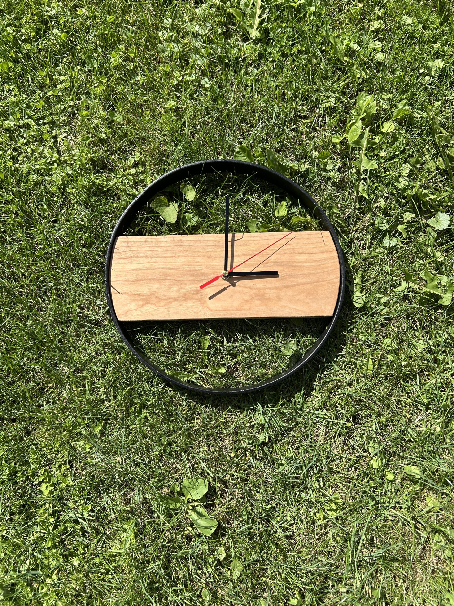 Ein Stück amerikanisches Kirschholz, das einst in stillen Wäldern gewachsen ist, trifft auf kühlen, schwarz lackierten Metallring – und wird zu einer Wanduhr, die mehr ist als nur ein Zeitmesser.